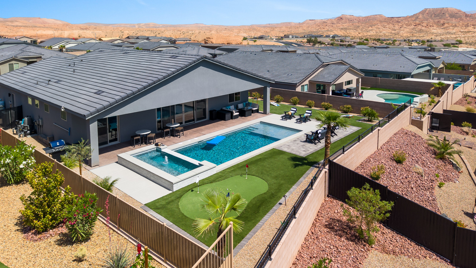 A break-away for six, come unwind and rejuvenate in our spacious retreat. Find refreshment in the lush pool following a morning of bike riding on the Virgin River bike path, a desert UTV adventure, or a round of world class golf. An airy kitchen awa...
